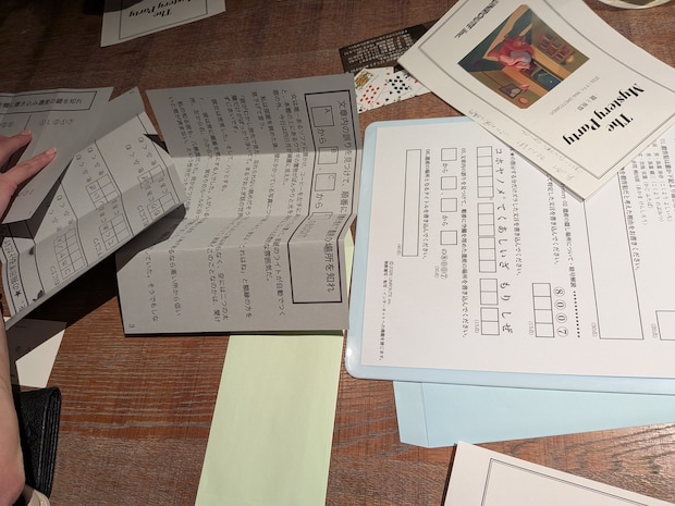 参加者はテーブルごとに謎に挑戦。「黒葉愛之介殺人事件」というタイトルで、写真や絵をもとに、ダイイングメッセージを解読して犯人を導き出す、というもの。机の上にトランプカードが置かれ、本棚や絵なども意味深です。文字の背列を五十音の表に当てはめて、ずらすことで別の言葉が浮かび上がるなど、もしかしたら謎解きイベントに慣れている人ならすぐ解けるのかもしれません。私は謎解き慣れしていないのでほとんどわからず、同じテーブルの人がどんどん解いていくのを後ろから眺めて応援していました。「犯人の候補は全員名前に数字が入ってますよね」などと発見したことを呟いたのですが、誰にも聞こえていないし特に関係なかったようです。難易度が高めで挑戦しがいがある問題でした。