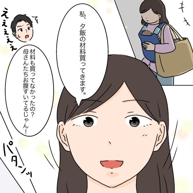 ホテルの手配もした上で「絶対にうちには泊まらせないで!」と念押ししていたにも関わらず、タケルさんは義両親を連れて何食わぬ顔で帰ってきました。さらにタケルさんは自分たちのベッドを義両親に使わせると言い出し、モエさんは絶句。義母は「泊まる部屋もないのね~」と呆れたように言うと「そろそろ本当に帰ってくることも考えたら?」と言い出しました。3人が話している隙にモエさんは急いで出かける準備をすると「夕飯の材料買ってきます」と言って家を出ました。