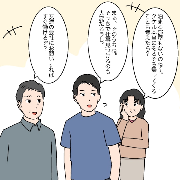 そして、私たちのベッドを勧められた義両親は遠慮するどころか、義母は「泊まる部屋もないのね~。タケル、本当にそろそろ帰ってくることも考えたら?」と言い出し、「まぁ、そのうちね。そっちで仕事見つけるのも大変だろうし」とタケルが言うと「友達の会社にお願いすればすぐに働けるぞ?」と勝手に乗り気になっている義父。