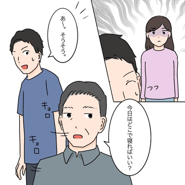 私の意見を無視して義両親を連れて帰ってきたタケルを無言で睨むと、笑ってごまかすタケル。すると、義父が「今日はどこで寝ればいい?」と言いながら部屋をキョロキョロ見回しました。