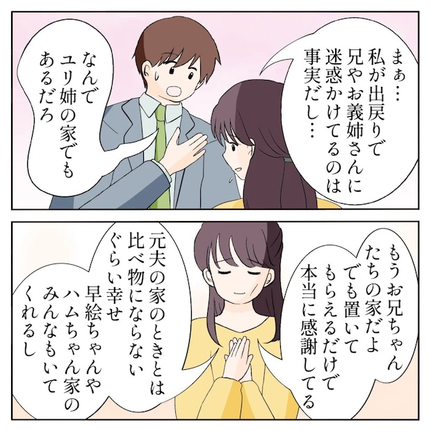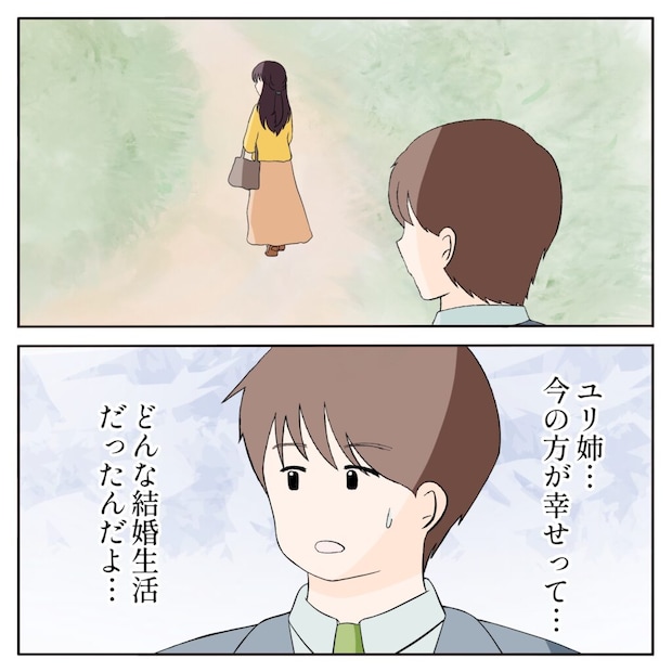 ある日、直帰で仕事を終わらせて家に帰る途中でユリ姉を見かけ、「うちから帰る途中か・・?」と思い声をかけようとすると、近所のおばさんが登場。「子どもも産めずに戻って来たんだから、お兄さんに迷惑かけちゃだめ」だの、「傷物なんだから我慢しないと」だの、「公輔くんの結婚にも障る」だのと言いたい放題。謝るだけで何も言い返さないユリ姉を見て、慌てて間に入り、おばさん達の悪口を我が家への忠告だと受け止めたと伝えると、おばさんたちはそそくさとその場から去って行きました。