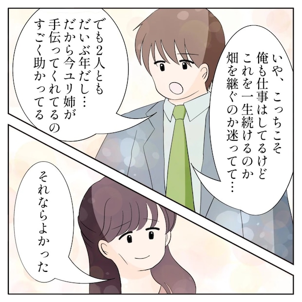 「いや、こっちこそ。俺も仕事はしてるけど、これを一生続けるのか畑を継ぐのか迷ってて・・。でも2人ともだいぶ年だし・・だから今ユリ姉が手伝ってくれてるのすごく助かってる」俺がそう言うと、「それならよかった」とユリ姉が答えてくれました。