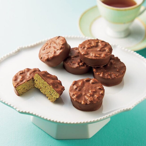 ピスタチオチョコレートに薄焼きクレープ生地のフィアンティーヌと刻みピスタチオ、隠し味にキャラメルチップでコクと食感をプラス。