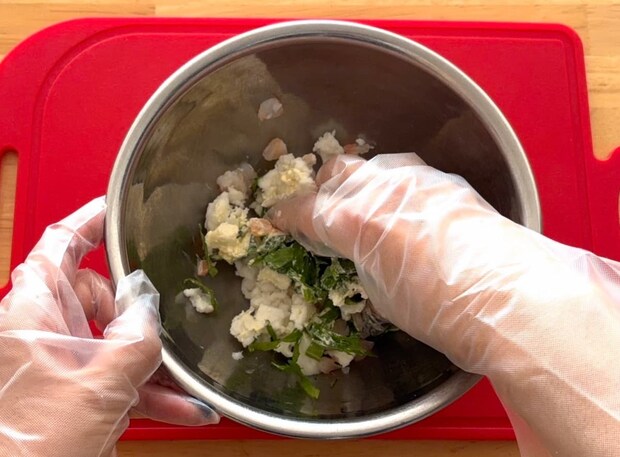 2. はんぺんを手で握りつぶすように細かくし、ボウルに入れ、えびと青じそ、塩、黒こしょう、マヨネーズを加え、よく混ぜる。