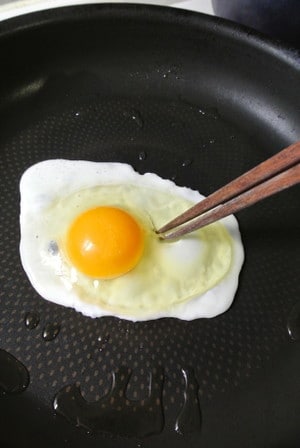 2.次に、黄身の周囲の“白身”を菜箸で広げましょう!こうすれば黄身がぷっくりと膨らんで、美しく仕上がるのです〜。