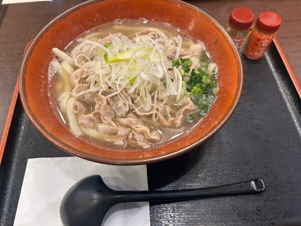 「こんぴら茶屋」では、名物「かれーうどん」の他、「冷やし こんぴらうどん」「天ぷらうどん」など多くのメニューを用意。その中でも尾藤さんのイチオシは、「岩中豚の肉うどん」1,380円だそう。