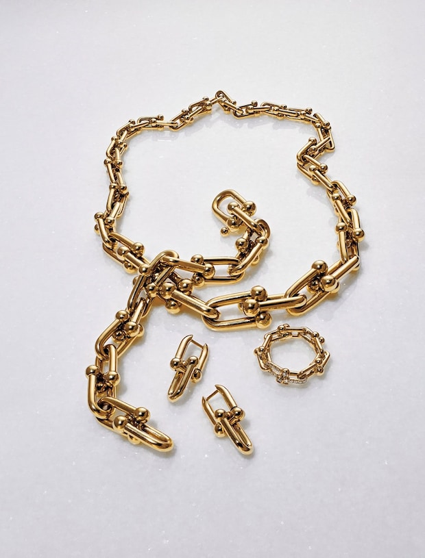 〈ティファニー ハードウェア〉ネックレス[YG]¥3,300,000、ブレスレット[YG]¥2,255,000、ピアス[YG]¥528,000、リング[YG×DIA]¥968,000(全てティファニー/ティファニー・アンド・カンパニー・ジャパン・インク)