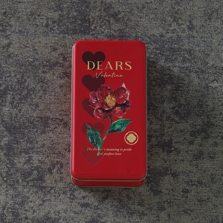 「DEARS ディアマンクッキー バレンタイン限定アソート缶」3,000円(税抜)は、深紅の缶にツバキの花をあしらったロマンティックなバレンタイン限定パッケージ。凛とした美しさと静かな華やかさを併せ持つデザインは、甘すぎない大人のバレンタインをイメージしている。