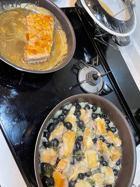 奥がマグロの柵ステーキ。手前がチキンのオリーブ煮、あと豚しゃぶからの海苔うどんまで色々と作らせて頂きました。