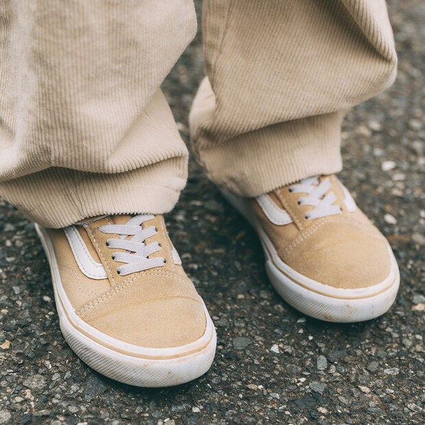 定番の『バンズ』のスニーカーはライトベージュに決まり! オフホワイトのコーデュロイボトムスを合わせて、質感のコントラストが新鮮な足元に昇華!