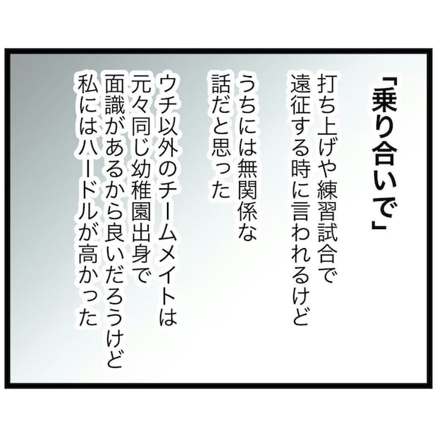 遠征や打ち上げを乗り合いで移動するのが当たり前の、仲の良い保護者たちに囲まれ、もっつんさんはますます輪に入れず、孤独を感じていました。