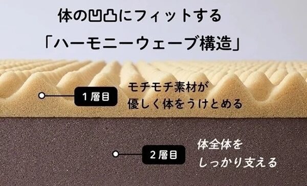 「suyara #001 Dot’sマットレス」は、快適さと寝姿勢サポートを両立するため、異なる2素材を組み合わせた「ハーモニーウェーブ構造」を採用。モチモチとした触感の上層部がやさしく体を受け止め、下層部がしっかりと支える。