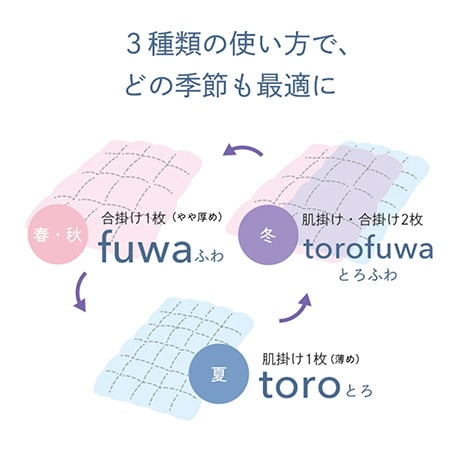 夏は薄めの肌掛け「toro」、春・秋は合掛け「fuwa」、冬はtoro・fuwaの2枚合わせ、と3種類の使い方ができる。中身の羽毛にはnishikawaの最高水準の加工を施し、自宅の洗濯機で洗える仕様となっている。専用ランドリーバッグ付きで、丸めてすっきり収納できる。