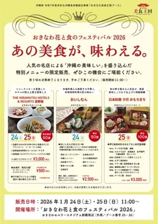 ブレーン沖縄が主催する「令和7年度多彩な沖縄食体験創出事業」の一環として、「おきなわ花と食のフェスティバル2026」会場で「おきなわ美食王国」が出展。沖縄県内3店舗による県産食材や沖縄食文化の粋を堪能できる特別メニューの限定販売を行う。