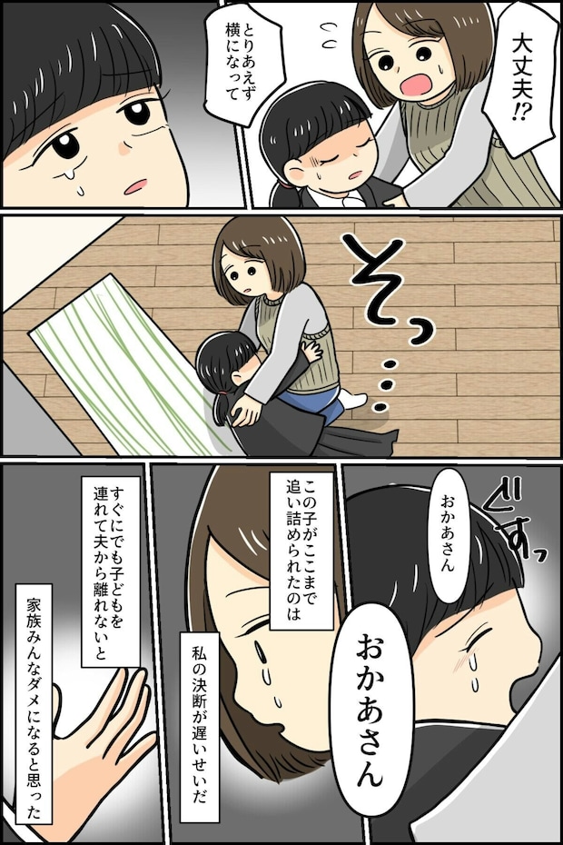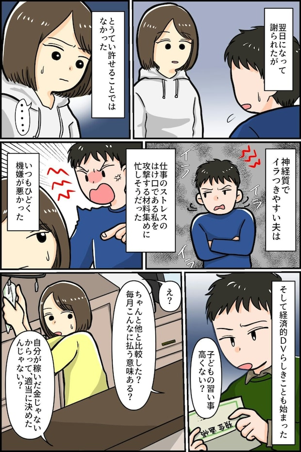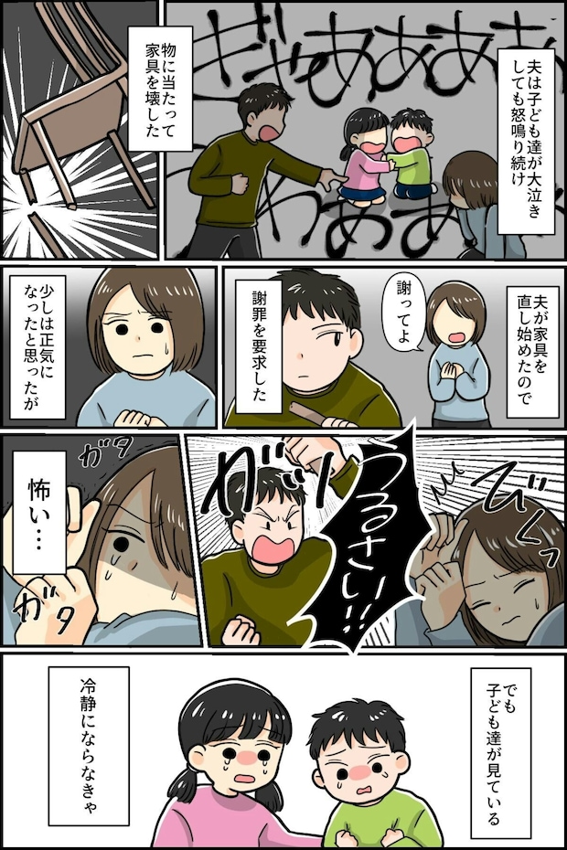 主人公も例外ではなく、容赦ない暴力が続きます。怒鳴ったり、殴られたり、それはとても恐ろしかったはずです。わが子の目の前でそんな行為を繰り返す夫。子どもたちの心的な負担も心配です。