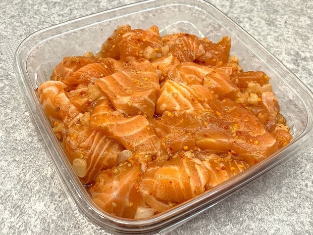 コストコの大人気商品であるアトランティックサーモンを使用した「ハワイアンサーモンポキ」をご紹介します。ポキシーズニングとごま油で味付けされ、細かくカットされた玉ねぎも入った一品です。
