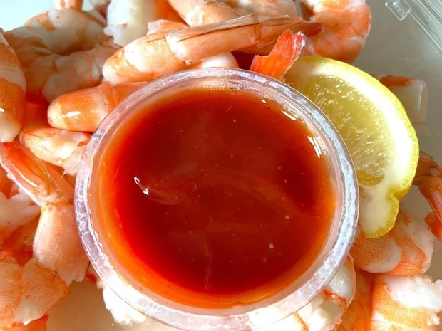 SNSでも海老尽くしで食べ放題のようだと人気の本品には、尾付きで背ワタの下処理がされた蒸し海老が、実数で34個も入っており、カクテルソースとカットレモンがセットになっています。
