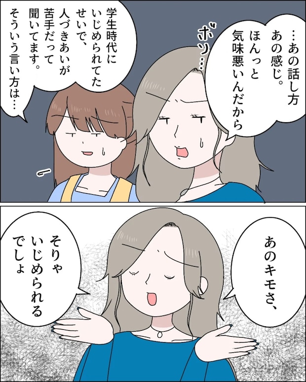 知佳さんが居なくなると、すかさず麻里さんが「・・あの話し方、あの感じ。ほんっと気味悪いんだから」とボソッと呟きました。「学生時代にいじめられてたせいで、人づきあいが苦手だって聞いてます。そういう言い方は・・」と遠慮気味にたしなめたものの、麻里さんは「あのキモさ、そりゃいじめられるでしょ」とさらり。