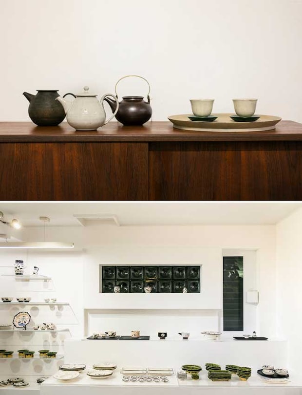 上/瓜田芙紗子さんの小湯呑み各2,640円、萩原千春さんのポット16,500円~ 下/取材時は菅野一美さんの個展の最中。作家の個展も定期的に開催される