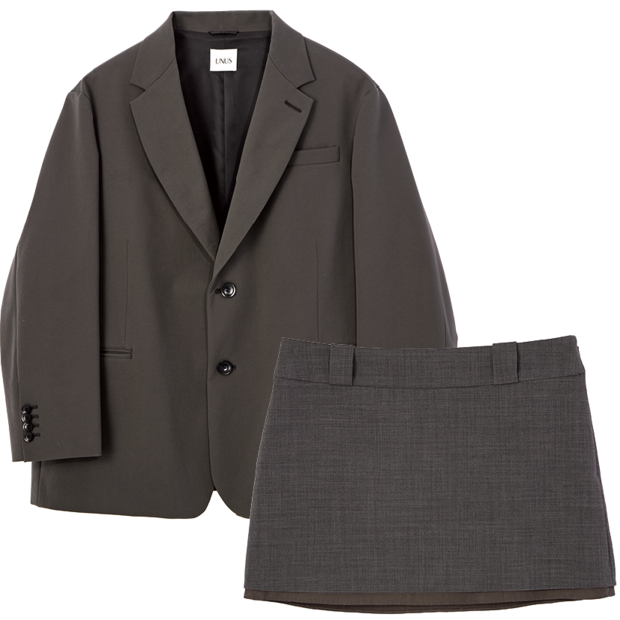 上から:オーバーサイズでハンサムな1着。ジャケット¥77,000、薄手の素材が裾から覗くレイヤード仕様。ミニスカート¥38,500(共にユナス/エストネーション)
