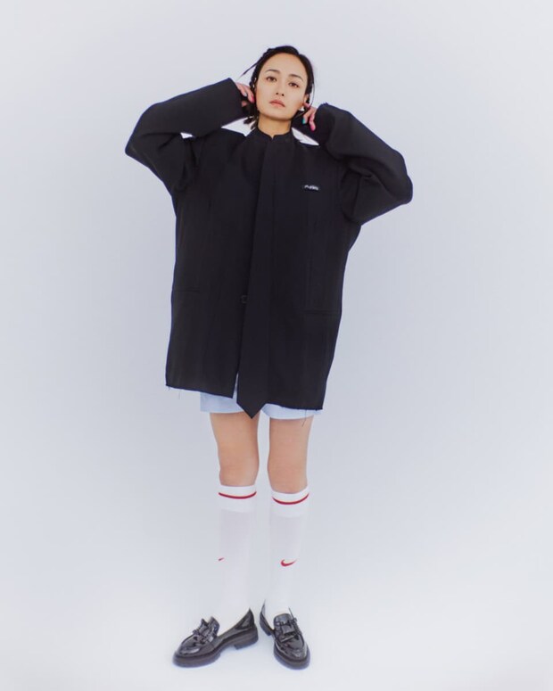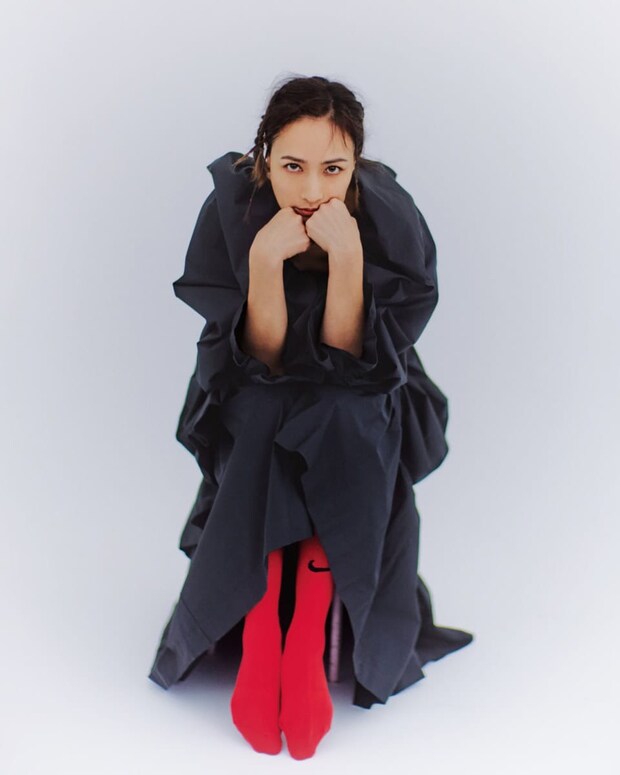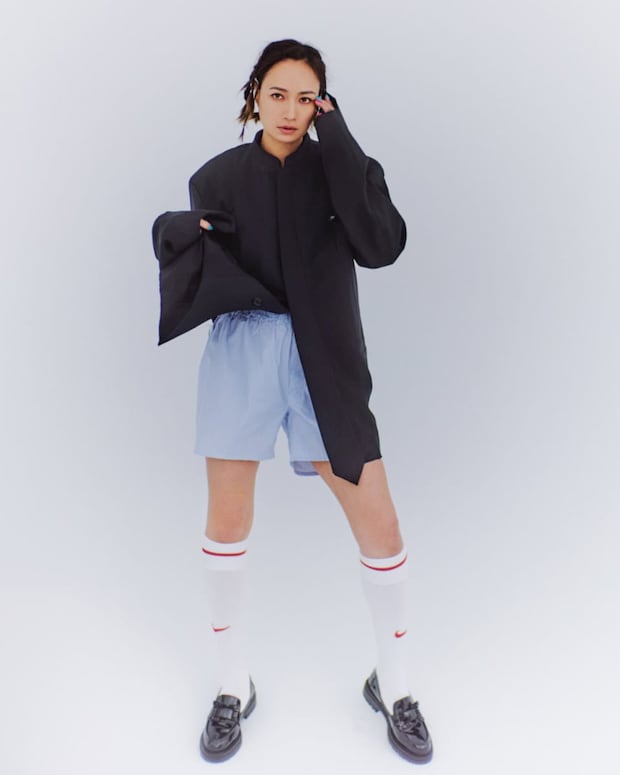 佐田さんとは今回が初対面。クールで美しいイメージがあったんですが、ボーイッシュなものも似合いそうだなと、今回は心からファッションを楽しむ、大人と少女の狭間のような気持ちを表現してみました。2つのスタイリングを繋いでいるのが「スポーツソックス」。普段からカラフルなタイツやネイルをアクセサリー感覚で取り入れるのは、私の定番です。無邪気に洋服を着てカメラの前に立つ佐田さんは、とても素敵でした。