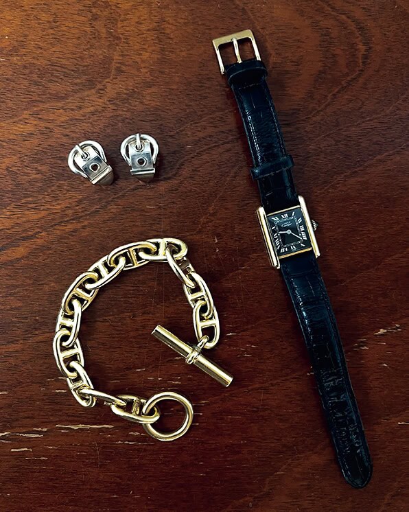 「ジュエリーや時計などの大物は記念日に購入します」。カルティエの時計、エルメスのチェーンブレスとピアスは中山さん私物