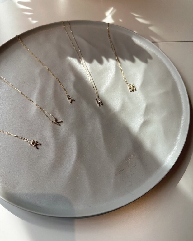 K 私はジュエリーはゴールド専門なんですけど、毎年、アブダビに買いに行ってるんですよ(笑)。友だちが向こうに住んでいて、年に一度会いに行って、そのときにゴールドスーク(編集部注:金の市場のこと)でまとめ買いしてます。種類も多いし、価格交渉も楽しいし。金の重さで価格が決まるので、その明解な感じも好きなんですよね。毎シーズン自分の欲しい1アイテムだけを作ってオンラインで売るっていうブランド「Har(ハー)」を昨年から始めたんですけど、ゴールド好きが高じて、ダイヤモンド入りのレタリングネックレスも作っていて。デイリーに使いやすいデザインにしたのでオススメです。こちらもチェックしてみてください。オーダー制なので、注文していただいてからお作りしています(笑)。