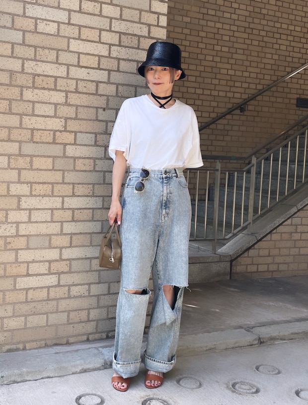 venitのTシャツ、AROMATIQUEのインナー、THINGS THAT MATTERのデニム、3.1 Phillip Limのサンダル、FOTTS FOTTSのバッグ、KIJIMA TAKAYUKIハット、kuronekoのシュシュは本人私物