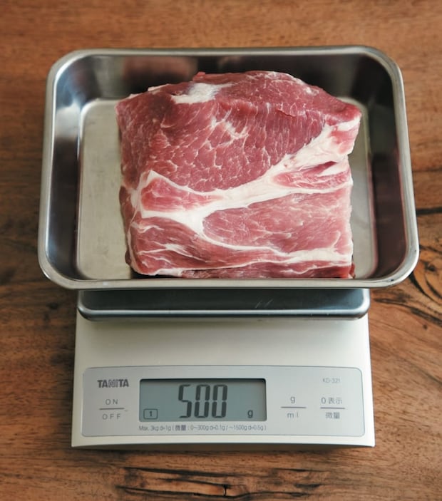 豚肉の重さを量り、重量の1%の塩を用意する。★豚肉が500gの場合、重量の1%の塩は5g。塩は精製されたものではなく、旨みや甘みを感じられる岩塩や天日塩などを使うと◎。
