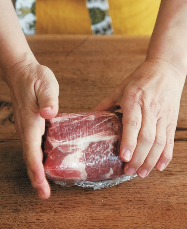 ②をラップでぴったりと包んでポリ袋に入れ、バットなどにのせる。冷蔵室に入れ、3〜4日おく。★空気が入らないようにラップでしっかり包むと、塩の浸透がよくなる。塩豚から水気が出るので、ラップで包んでから袋に入れ、バットにのせて。