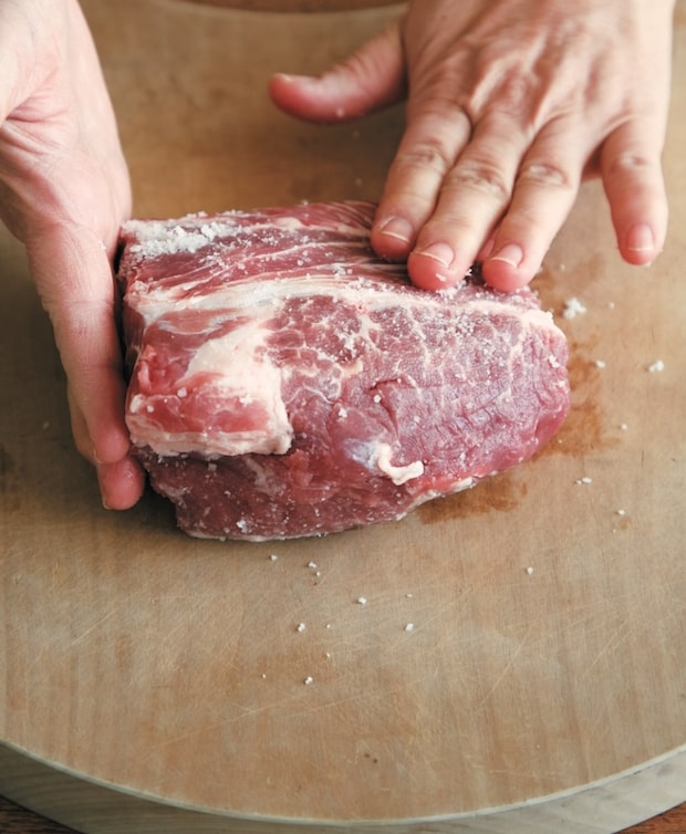 豚肉はペーパータオルで水気をしっかりと拭き、塩を全体にすり込む。★豚肉は余分な水分を拭き取り、臭みをおさえて。岩塩や天日塩をすり込むと、かたまり肉の中まで味が入り、おいしく仕上がる。