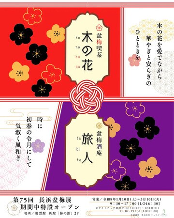 また、長浜市榎木町の佐藤酒造との共同企画で、「長浜盆梅展」で管理している梅の実を使用したオリジナル盆梅梅酒「長浜盆梅」が完成。慶雲館新館「梅の館」2階の売店にて、300ml・1,200円(税込)で販売されるほか、「盆梅酒庵 旅人~tabito~」でも1杯700円で提供される。