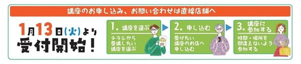 会場は各店舗。受講時間は、およそ60~90分だ。受講料は原則無料だが、一部材料代などの参加料が必要な講座もある。