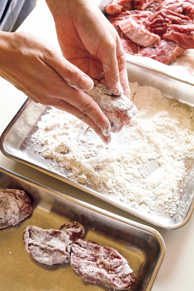 牛肉は赤ワインで下味をつけてから薄力粉をまぶすと、風味がよく肉汁もとじ込めます。1時間以上漬ければOK。前日から漬けても。