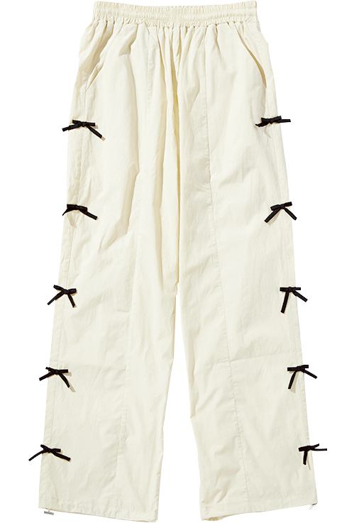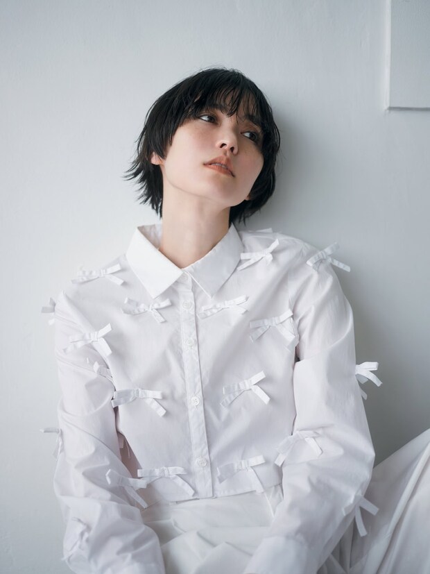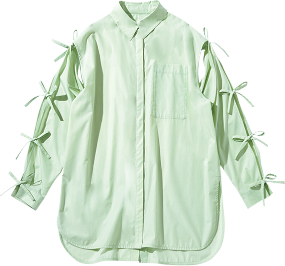 前面と袖にリボンがたっぷりとあしらわれたシャツは、着る側に確かな高揚感を与えてくれる自分“アゲ”服。合わせのアイテムはメンズライクなものを選ぶ、シンプルな着こなしのポイントにするなど、全身ブリブリにならないようにだけご注意を。リボンブラウス¥16,280(pain)、パンツ※メンズ¥41,800(グラフペーパー/グラフペーパー 東京)