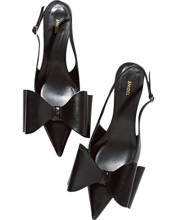 フロントの大きく立体的なおリボンがインパクト大。ポインテッドトウならシャープにはけて◎。ミュール[ヒール5.2㎝]¥16,500(スナイデル/スナイデル ルミネ新宿2店)