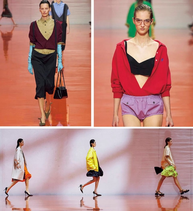 「プラダは色に魅了されたコレクション。ひとつのルックの中での色の掛け合わせの妙もそうだし、ショー会場の床の色、あのオレンジ、空間への光の入り方、本当に美しかった」(スタイリスト風間ゆみえさん)、「新鮮さを感じる色とレイヤリングの着こなしが可愛かったです。“黒”が代名詞の私が、このコレクションではペールブルーのバルーンスカート、ブラウンのブラ、ブルーの巾着バッグなど、カラーアイテムに惹かれてオーダーしました」(スタイリスト金子綾さん)