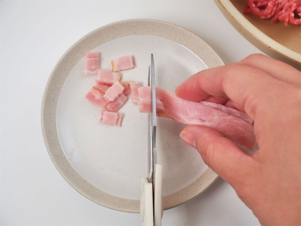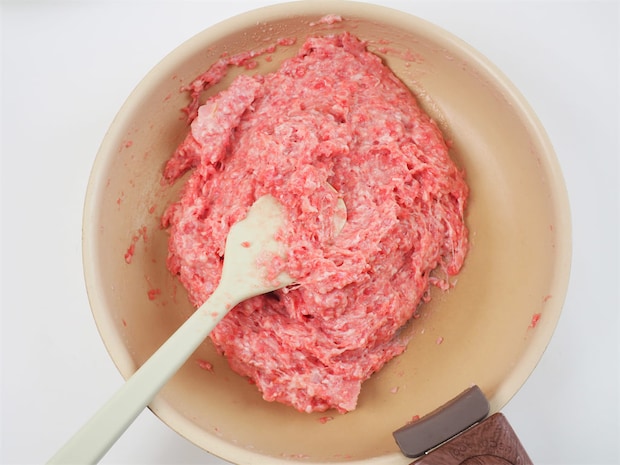 肉ダネが少し糸を引くくらいが目安です。シリコンベラを使えば、手の熱で脂が溶け過ぎる心配もなく、手を洗う手間もなし!