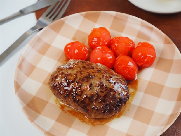 7. お皿にハンバーグ、ミニトマトを盛り付けて、フライパンに残ったソースをかけたら完成。