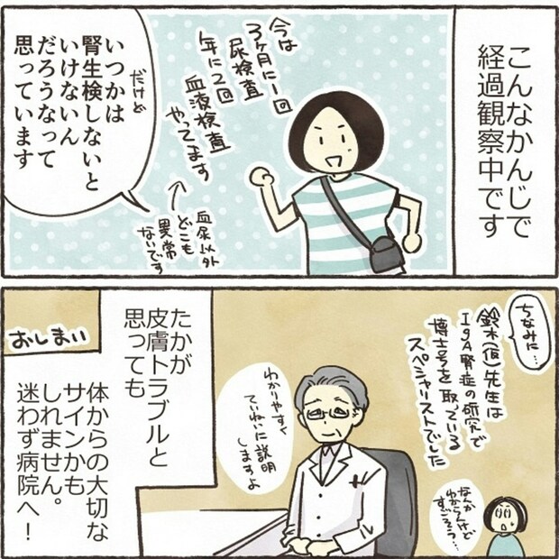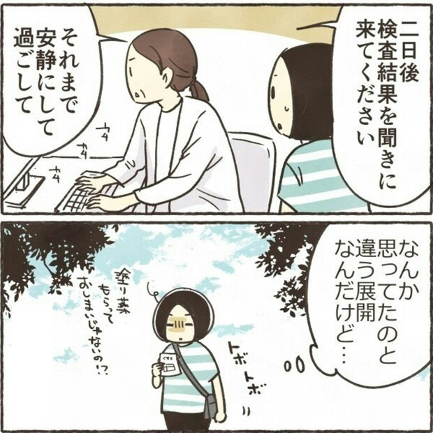軽い気持ちで受診した皮膚科で、塗り薬をもらって終わりだと思っていたきなこさんは、思わぬ展開に戸惑います。足の湿疹と尿検査は、どんな関係があるのでしょうか。不安が募る中、検査結果を待つことになりました。