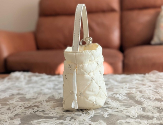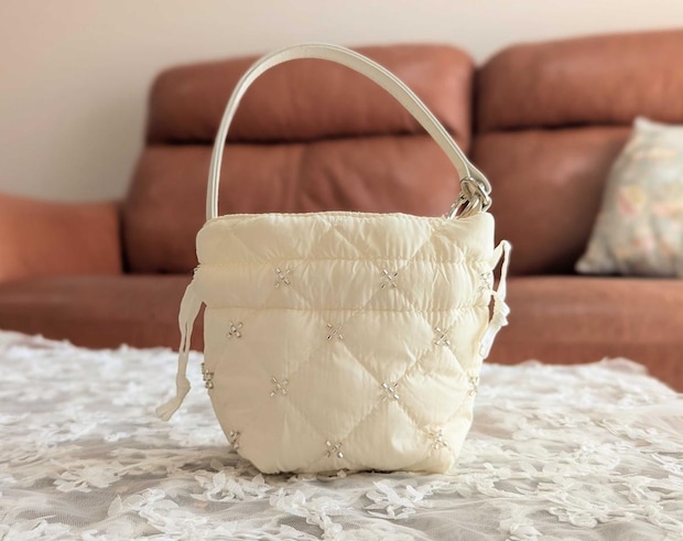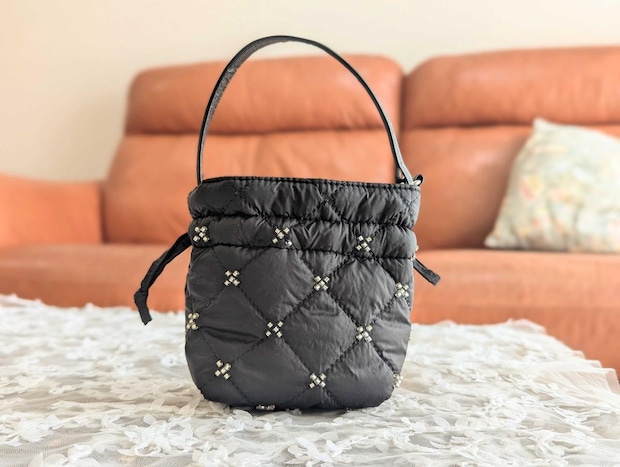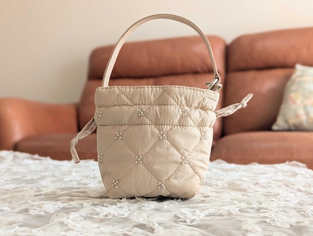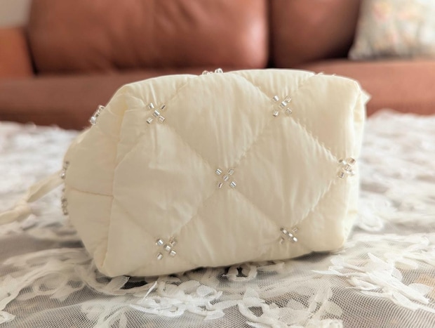 ふんわりとしたキルティング生地にビーズが散りばめられており、330円とは思えない丁寧な作り。 間違いなく「お値段以上」の高見えアイテムです。