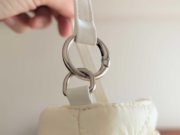 上部にカラビナ(キーリング)が付いているので、バッグの外側にバッグチャームとして取り付けることができるんです。