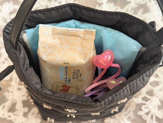 ポケットティッシュ、ウェットティッシュ、ばんそうこう、髪ゴムなど、細々としたアイテムをまとめて収納。