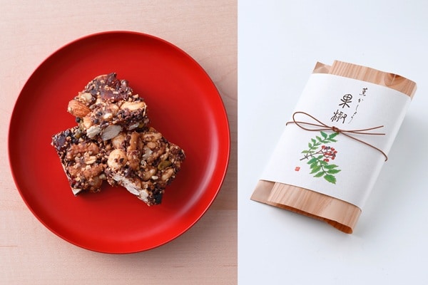 「薫 果椒 カカオニブ」2,160円(税込)は、数種の木の実やドライフルーツ、小豆を寄せ固め、ぴりりと爽やかな実山椒を忍ばせた和久傳の定番菓子「果椒」にカカオニブを加えた、この季節だけの味わい。木の実の香ばしさ、果実の自然な甘み、山椒の清涼感にカカオのほろ苦さと香りが重なり、ひと口ごとに奥行きが広がる。小さく切り分けて少しずつ、コーヒーやワインと一緒にゆっくりと香りの変化を楽しめる一品だ。