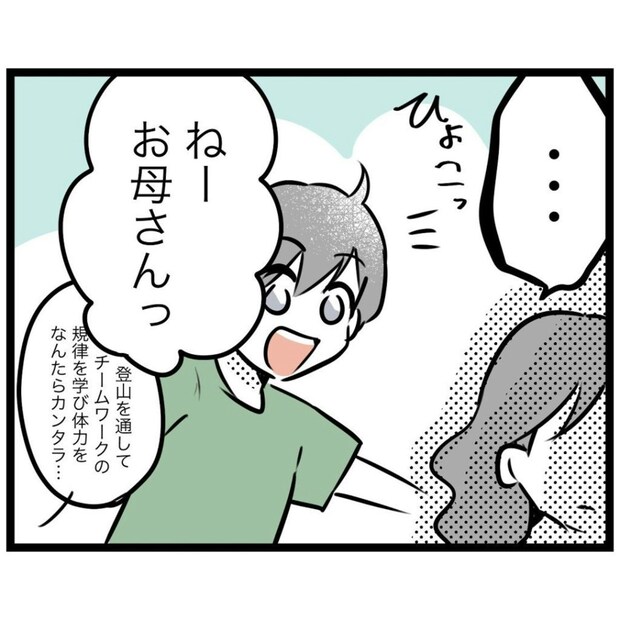 父親同伴を推奨された登山訓練。けれど、もっつんさんの夫は休みを取れないかもしれません。となると、送迎から登山まで、もっつんさんがすべて担うことに…。