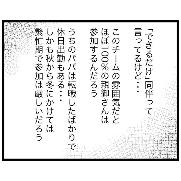 練習試合の打ち上げに参加したもっつんさんは、他の保護者と打ち解けることができずに居心地の悪さを感じていました。そんな中、チーム部長から登山訓練をすると発表され、もっつんさんの気持ちはますます重くなっていきます。