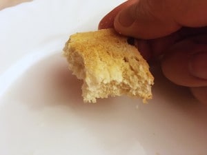 4.では、試食してみましょう。…カリッとした食感のあとに、ふわっとした柔らかさがやってきます!うんうん、これぞ求めていた至福の焼き上がり。いつもの焼き方よりも、ふわふわ感が増していますよ〜!