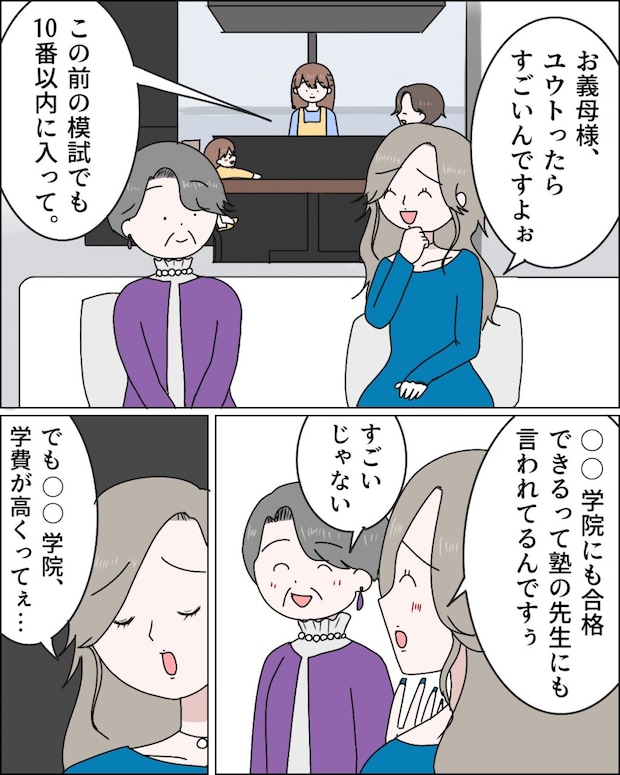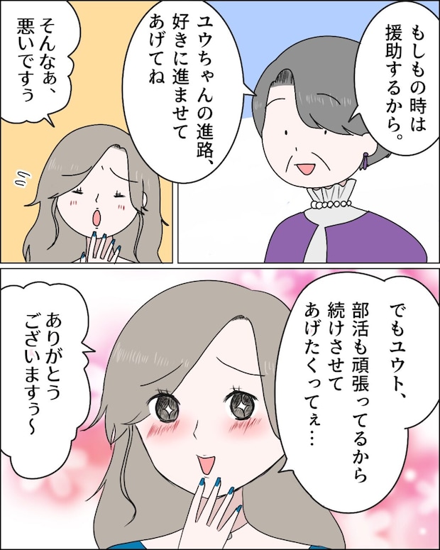 義母は迷うことなく「もしもの時は援助するから。ユウちゃんの進路、好きに進ませてあげてね」とにっこり。麻里さんは「そんなぁ、悪いですぅ」と大げさに遠慮してみせますが、すぐに「でもユウト、部活も頑張ってるから続けさせてあげたくってぇ・・。ありがとうございますぅ~」と義母の申し出をすんなり受け入れました。