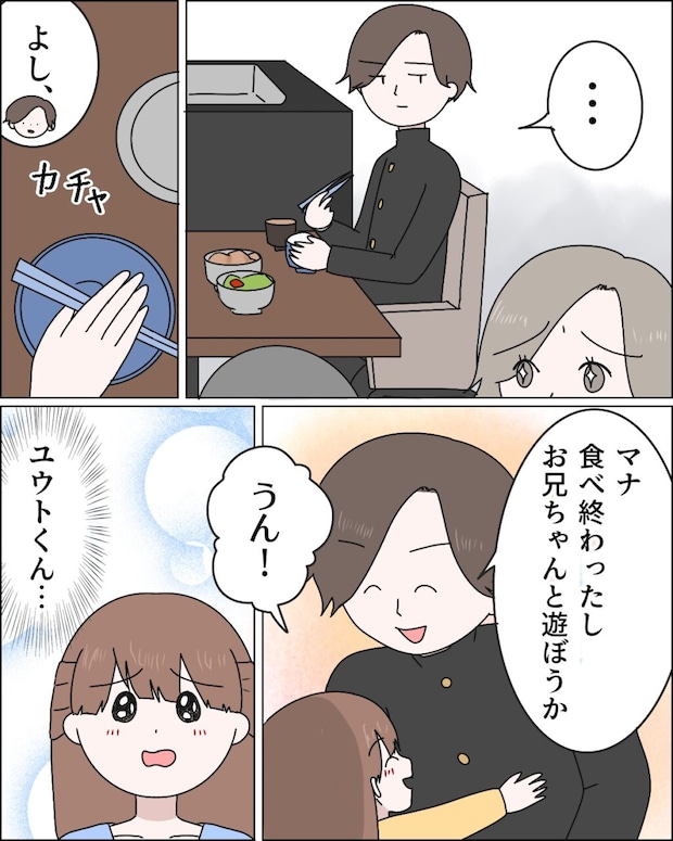 麻里さんと義母の会話はダイニングにもしっかり届いており、ユウトくんはご飯を食べながら何か言いたげな表情で麻里さんを見つめていました。ユウトくんは食事を終えると「よし、マナ。食べ終わったしお兄ちゃんと遊ぼうか」と言ってくれ、「うん!」と嬉しそうにユウトくんに駆け寄るマナ。ユウトくん・・なんて優しくて面倒見がいいんだろう。
