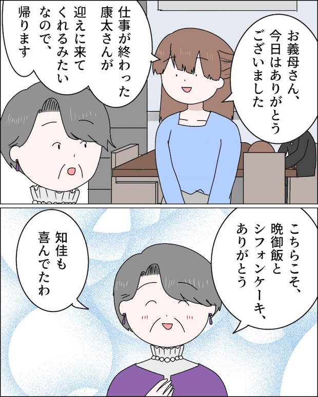 ちょうど後片付けも終わったので「お義母さん、今日はありがとうございました。仕事が終わった康太さんが迎えに来てくれるみたいなので帰ります」と声をかけると「こちらこそ、晩御飯とシフォンケーキ、ありがとう。知佳も喜んでたわ」と義母が笑顔で言ってくれました。